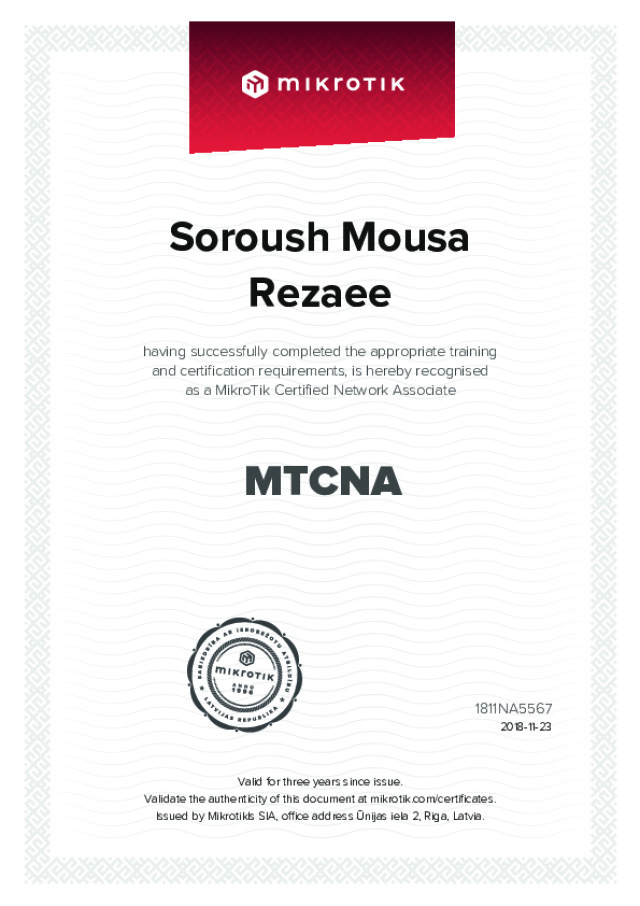 | 2018 | MikroTik Certified Network Associate Training (MTCNA) | MikroTik | Network Fundamentals·Router Configuration | |