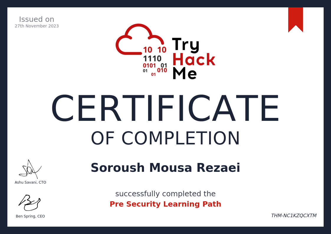 | 2023 | Pre Security | TryHackMe | Cybersecurity Fundamentals·Security Awareness | |